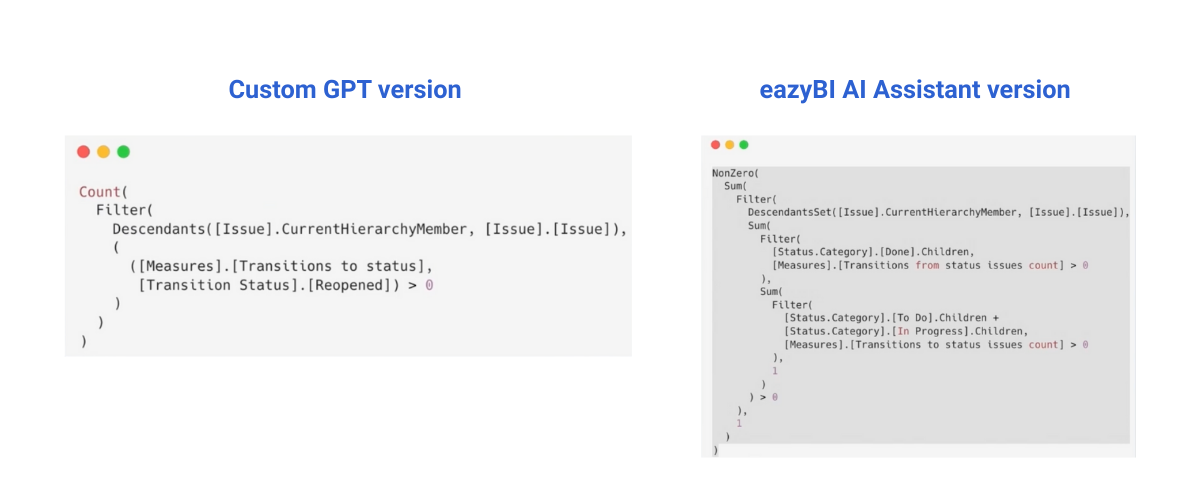 When eazyBI AI Assistants were introduced, Mindaugas decided to compare both of the AI tools – his custom GPT for MDX calculations and then the just-released AI Assistant. Most of the requests I get revolve around MDX formulas. Take a seemingly simple question like: “How many issues were reopened at least once?” His custom GPT assumed he was interested in tracking transitions to a specific “Reopened” status. Meanwhile, the eazyBI Assistant interpreted it as a status category change. Both missed what he actually needed.