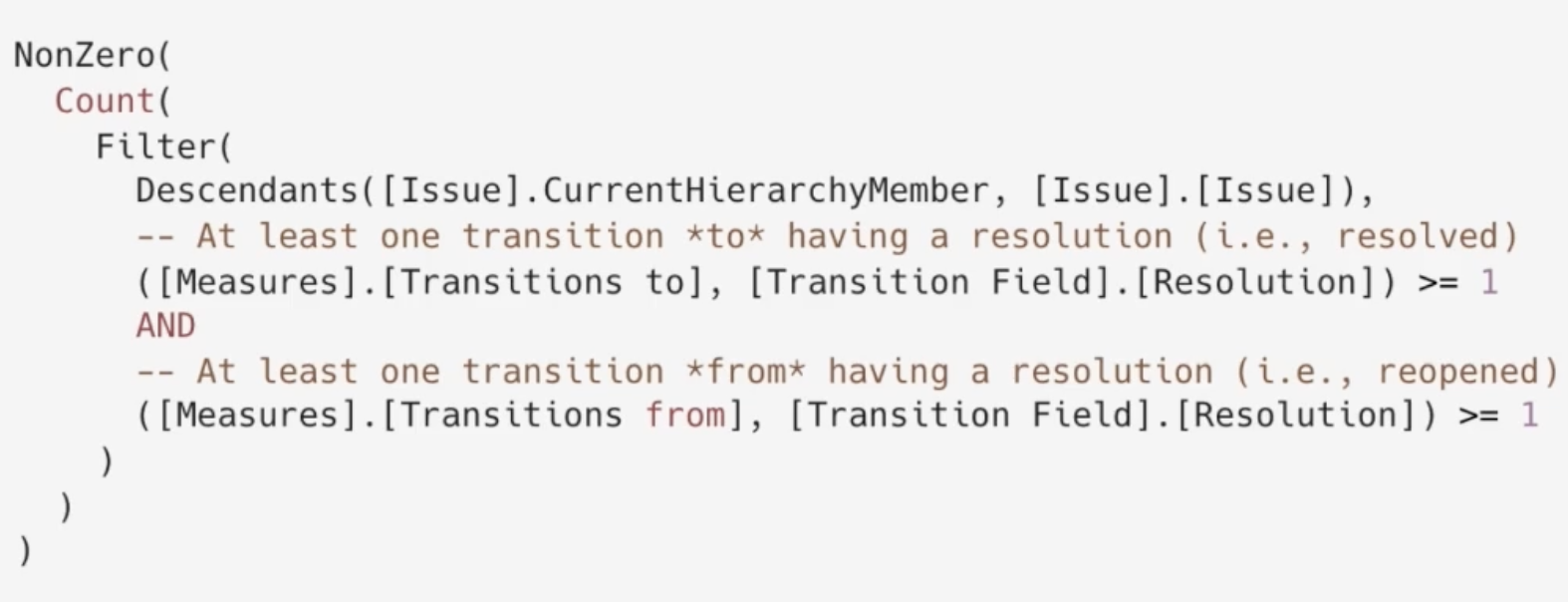 If a more precise prompt was provided – something like: “I want to create a calculated measure that counts issues that had at least one change to the Resolution field (i.e., were resolved at least once) and later had the Resolution field cleared (i.e., the issue was reopened). The logic should be based on the Resolution field transition, not status changes.” – The correct answer would have come much sooner.