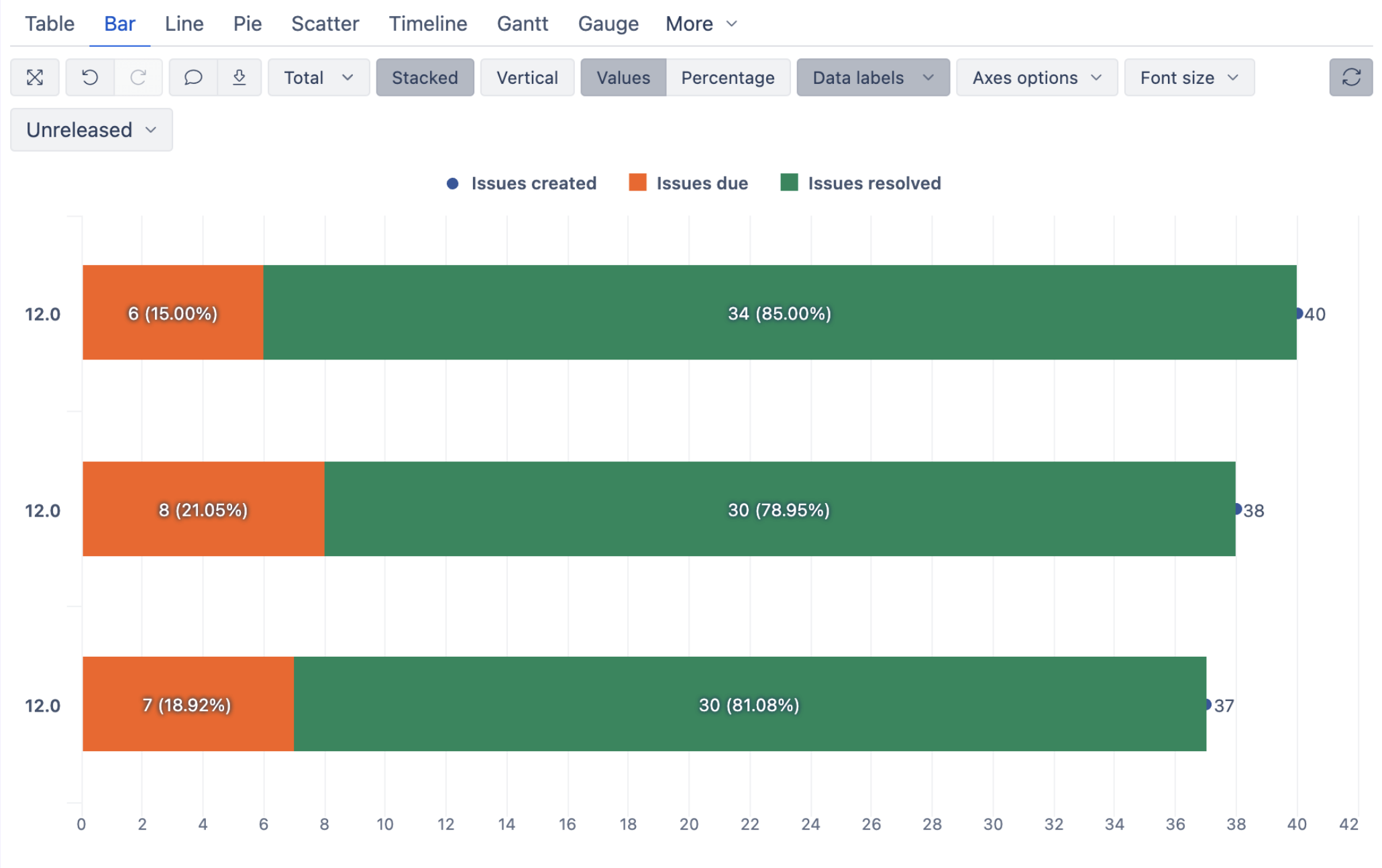 One of the lessons is the Fix version progress report. Here, you will build a visual overview of unreleased versions, showing the total scope alongside resolved and unresolved work. By combining bars and scatter points in a single chart, the report makes it easy to see how much work has been done, how much remains open, and how each version is progressing at a glance.