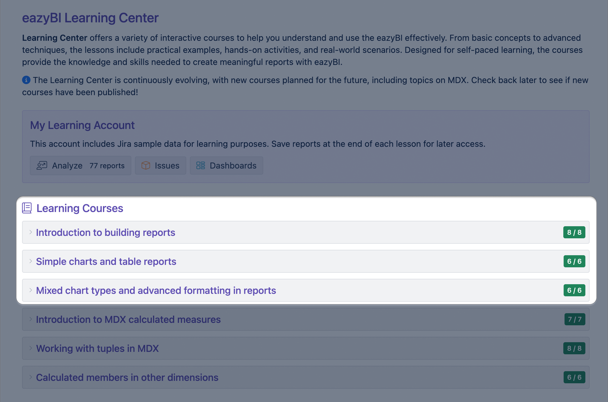 And when you’re ready to go further, the eazyBI Learning Center grows with you. You can continue into the introductory MDX courses to learn how to build calculated measures and expand what your reports can do — all with the same guided, practical approach that helps you learn with confidence.