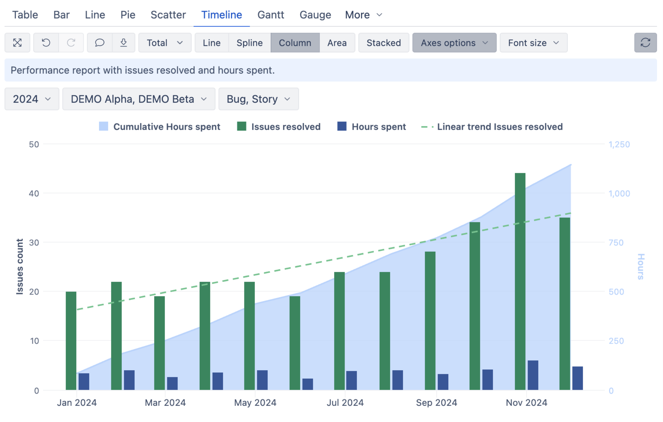 In the Performance report, part 2/2 lesson, you will bring these ideas together by creating a timeline that combines issue resolution trends with time tracking data. The chart shows how effort and delivery evolve over time, using columns, areas, and trend lines on separate axes to keep each metric easy to read.