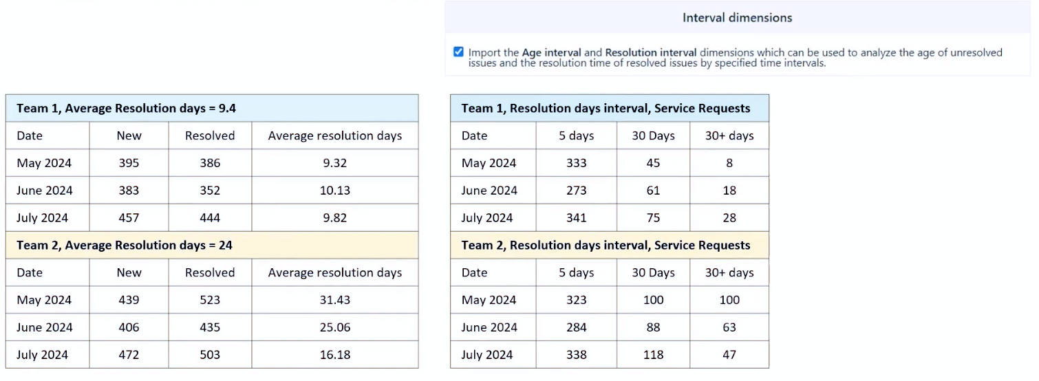 Another report, Issues Due Over Age Interval, showed that Team 2 had worked hard to reduce a large backlog—while Team 1 was heading toward the same issue of unresolved tickets piling up.