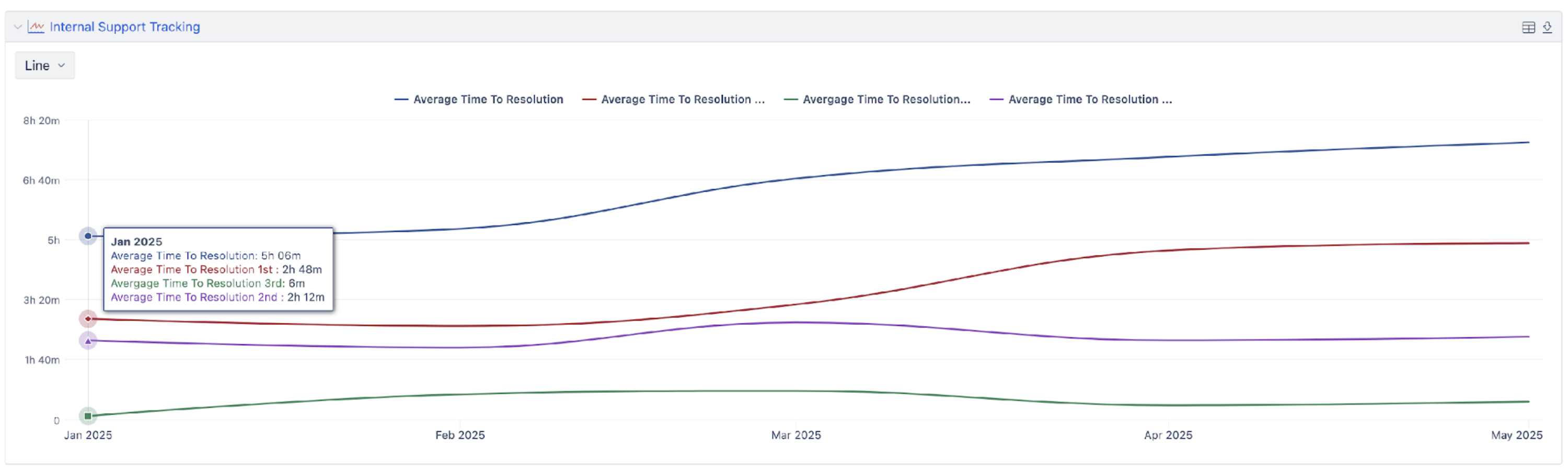 When you find that the overall resolution time is increasing without additional context, it might suggest a general slowdown across the entire process. However, once the data is broken down by support level, it becomes clear that the first-line support has taken longer than before, while the other levels remained stable.
